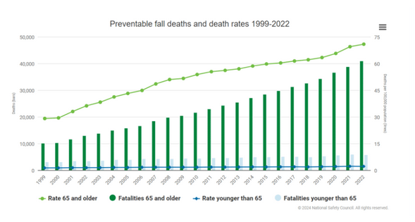 As our population ages, the prevalence of falls among older adults is increasing. According to the CDC, more than one in four older adults report a fall each year. In 2022, 40,919 older adults aged 65 and older died from preventable falls, and over 3.5 million were treated in emergency departments. Over the past 10 years, the number of older adult fall deaths has increased 60%, while emergency department visits have increased 43%. At the same time, the number of fall deaths among individuals younger than 65 increased 20%, but emergency department visits have decreased 21%.
